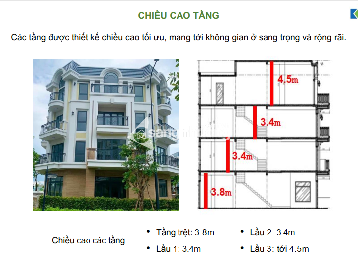 + Độ cao của mỗi tầng tương ứng: trệt (3m8), lầu 1 (3m4), lầu 2 (3m4), lầu 3 (4m5)