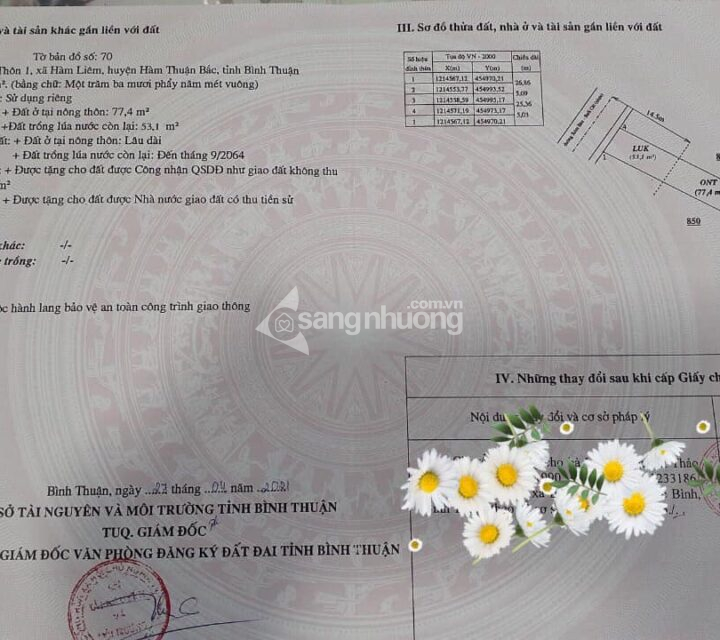 Đất Hàm Liêm – TP Phan Thiết Cần bán đất mặt nhựa Hàm Liêm, cách Uỷ Ban, chợ, trường học… khoảng 1.2km. – DT: 130,5m2 có 77,4m2 thổ cư – Giá: 830tr – Liên hệ xem đất: An 0907668697